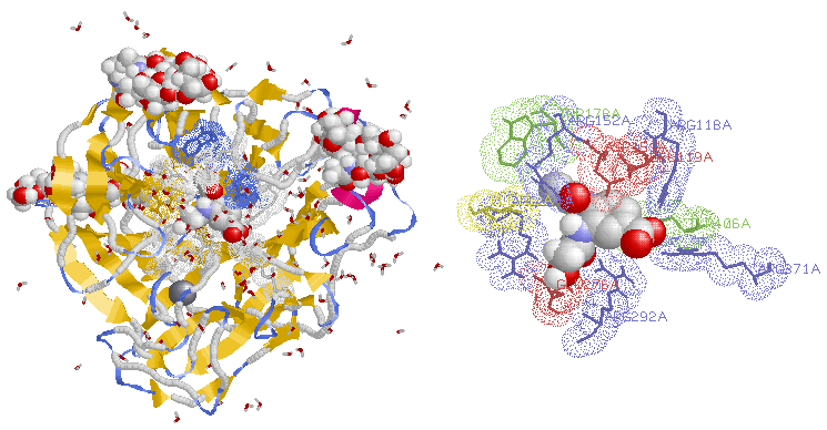 同じく2qwkの糖鎖別着色データ(左;糖タンパク質データ集参照)とPQSによる四量体モデル(右;PQSデータ集参照)