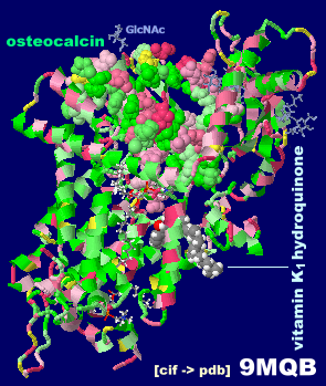 オステオカルシン(osteocalcin)とビタミンK1ヒドロキノンが結合したビタミンK依存性γ-カルボキシラーゼ9mqbとPDBsumデータ