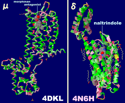 μオピオイド受容体4dkl(モルフィナン系アンタゴニストが結合)とδオピオイド受容体4n6h(ナルトリンドール〈naltrindole〉とNa+イオン結合)
