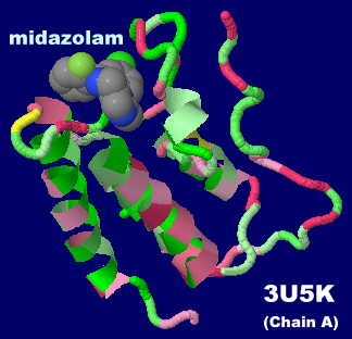 左から ミダゾラム(midazolam),同分子結合BRD4の構造3u5kのChain AとPDBsumデータ