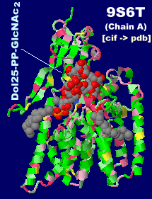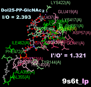 Dol25-PP-GlcNAc2が結合したマンノシルトランスフェラーゼ9s6tのChain AとPDBsumデータ