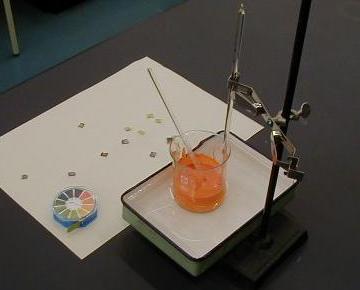 また,反応中カップリング溶液はアルカリ性であることが必要なので,pH試験紙で確かめる(下の写真)。もし酸性に近くなっているようならば水酸化ナトリウム(0.5〜1g)を加える。
