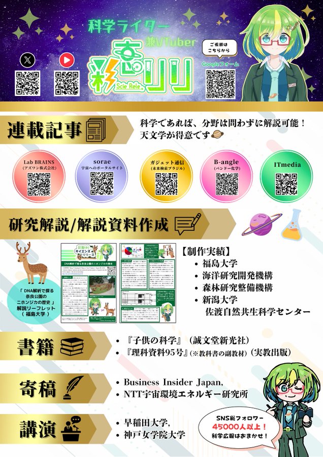 ▼参考Webページほか ツイッター:@Science_Release 彩恵りりの科学ニュース解説! - Lab BRAINS - アズワン 記事例 “宇宙最初の化学分子”は、これまで以上に恒星誕生に重要と判明!(2025/08/08) [NEW!] 2025年ノーベル生理学医学賞について分かりやすく解説!『末梢性免疫寛容の発見』(2025/10/07) [NEW!] 2025年ノーベル物理学賞について分かりやすく解説!『電気回路における巨視的な量子力学的トンネル効果とエネルギーの量子化の発見』(2025/10/08) [NEW!] 2025年ノーベル化学賞について分かりやすく解説!『金属有機構造体の開発』(2025/10/09) [NEW!] 2025年『第35回イグノーベル賞』10賞全部解説!(2025/09/22) [NEW!] 彩恵りり - sorae 宇宙へのポータルサイト 最近の記事例 「宇宙の馬蹄」を作る観測史上最大級のブラックホールを発見 太陽360億個分の質量(2025/09/21) [NEW!] 合成困難な “スーパーアルコール” 「オルト炭酸」を初合成 宇宙の氷に含まれる?(2025/08/28) [NEW!] 惑星「K2-18b」の生命関連分子は “見間違い” かもしれない? 懐疑的な研究結果(2025/06/04) [NEW!] 彩恵りり - ITmedia 著者別インデックス 最近の記事例 明日使える“論文の雑学” ちょっと変わった論文たち 「本文0文字」「ネコが書いた」「著者が5000人超」など(2025/08/05) [NEW!] 2023年5月に解説した科学ニュース一覧|彩恵りり|note(2023/07/31) 解説記事:子供の科学 2025年7月号(誠文堂新光社) [NEW!] ※上掲sorae記事の解説掲載 授業の様子:バーチャルサイエンスライターの彩恵りり先生にプロジェクト科目で講義いただきました。(神戸女学院大学,2024/12/20) (適宜追加します)