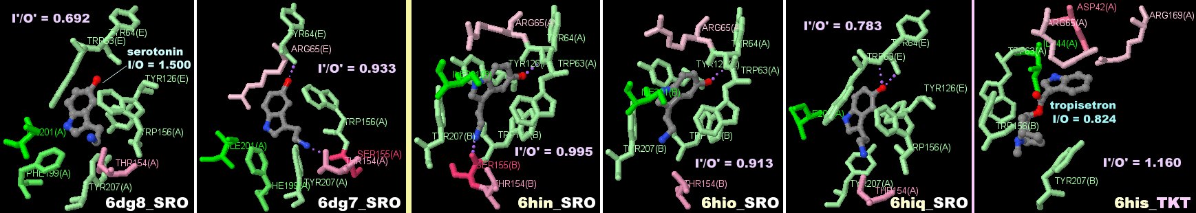 2件の研究による5-HT3A受容体のPDBsumデータ;左から5データはセロトニン(「亀-C-C-N」構造あり)結合,右端はトロピセトロン(tropisetron)結合 → Jmolトピック