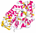 図 タンパク質の高次構造例(タカアミラーゼ) → PDBデータ/6taa.pdb※ピンクの部分がα-ヘリックス構造,黄色い部分がβ-シート構造