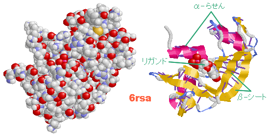 図4 Chimeによるタンパク質の表示例(PDBデータの6rsa;PDBのデータIDは4文字の数字とアルファベットで表記される)。左の空間充填表示を右のような二次構造表示にすることで立体構造の特徴が明確になる(━は水素結合)。